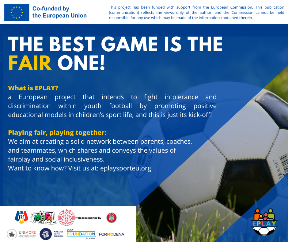 The main aim of EPLAY is to promote fairplay behaviours among parents of children aged 8-14 years playing football, with a special look to interethnic and gender discrimination