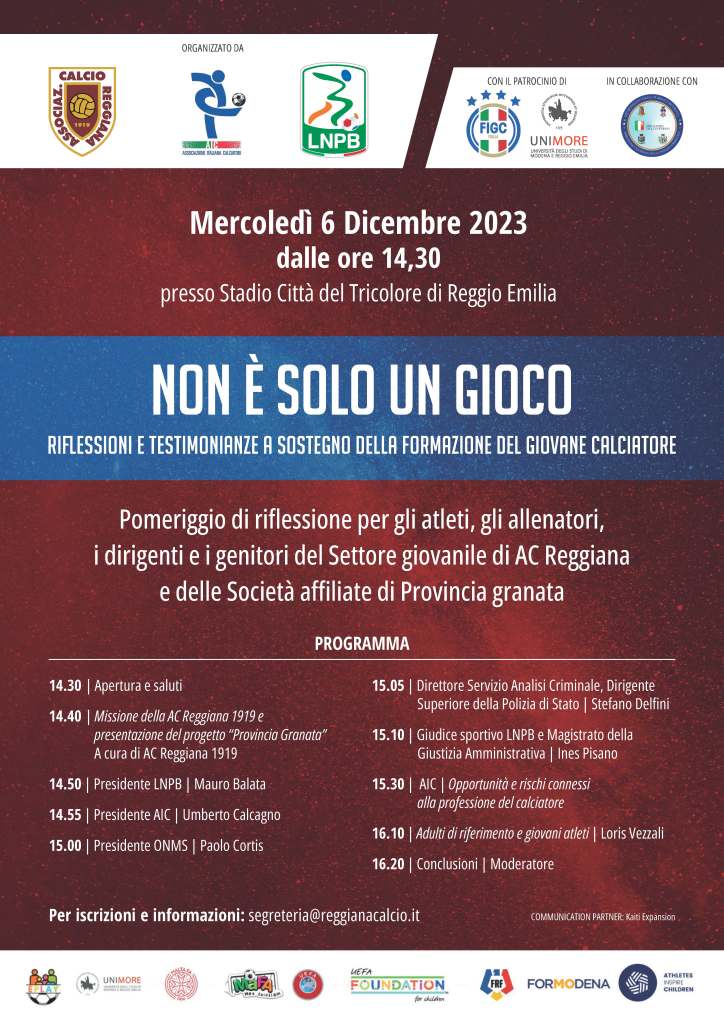 Organization event “Non è solo un gioco: riflessioni e testimonianze a sostegno della formazione del giovane calciatori” [“It isn’t just a game: Reflections and testimonies supporting education of young players”]. The event was organised to discuss recent risks for young players, including dependencies on pharmacology or bets, match fixing, other disfuntional behaviours. These were discussed with main actors of Italian football, including a professional team (AC Reggiana), President and lawyer of Lega Serie B, President Associazione Italiana Calciatori, President National Observatory of Sport Events of the Ministry of Interior, Representatives of Police, Sport Magistrate, Sport Psychologist, UNIMORE in terms of social and developmental psychology, role model football players, players engaging in disfunctional behaviours disclosing their experience. The event was attended to by authorities (Emilia-Romagna Region, UNIMORE, Reggio Emilia municipality, Reggio Emilia Province, Reggio Emilia Police, Montecchio Municipality, Reggio Emilia Carabinieri, Ministry of Interior), members from sport organizations, as well as civic society, grassroot football players, students. The event was attended to by many more persons who did not sign the attendance list (including teams from the female grassroot teams of AC Reggiana). Videos of the event were created, also for public dissemination. The event had a good media response.