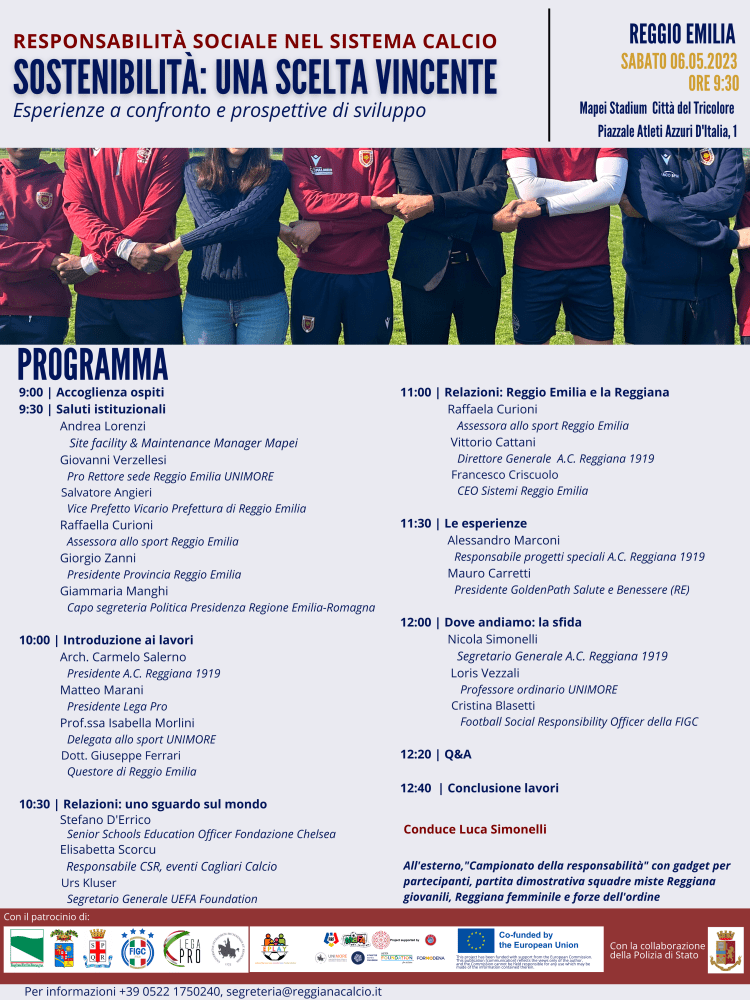 Organisation event on sustainability in football, in relation to the importance of creating safe sport environments for young people, but also use football values to spread the importance of well-being related to social inclusion and anti-discrimination, with the involvement of main actors like parents, football teams, institutions. The event was organized at the MAPEI Stadium in Reggio Emilia, and was attended to by several institutions, citizens, and students. It included a conference, with speakers being representative of local and national civil and sport institutions, like: Police and Municipality Reggio Emilia, University of Modena and Reggio Emilia, representative Region Emilia-Romagna, Football Social Responsibility Officer Italian Federation of Football (FIGC), President Lega-Pro Italy, President UEFA Foundation for Children, Manager Foundation Chelsea, Manager Cagliari Calcio, President Reggiana Calcio, representatives of local sponsors and sport partners. The event also included a practical “field” part, where students and citizens took part to football activities structured psychologically to foster a sense of social responsibility and the role of football, so that they could “play” social responsibility. These activities were also meant to make the familiarize with the activities conducted by UNIMORE, making clear what football can do for people. Activities and conference were attended to by at least 150 people, including several representatives of institutions. Unfortunately, only a fraction of them signed the attendance list. Official presents are therefore of 40 males and 16 females, for a total of 56 persons.
