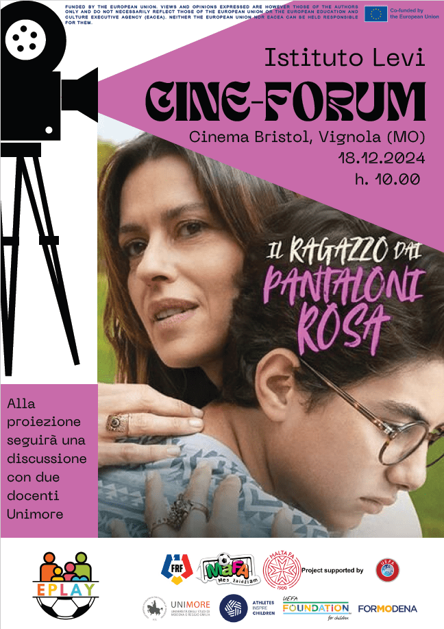 On Wednesday, 18th December 2024, in collaboration with the University of Modena and Reggio Emilia and FORMODENA, within the framework of the European project EPLAY, an anti-bullying awareness initiative was conducted. The initiative included a cineforum, during which participants –students of the Levi Institute, Vignola (MO)– watched the movie “Il ragazzo dai pantaloni rosa” (The Boy in the Pink Pants). Following the screening, the audience participated in a collective discussion moderated by two UNIMORE professors, along with student representatives and a teacher. Participants discussed on the importance of respecting others and standing against injustice.